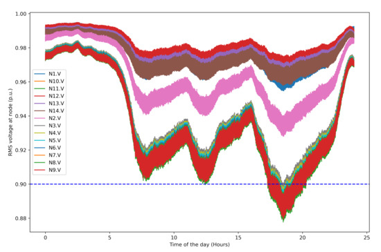 The RMS values of the node voltage for eleven nodes are also not within the permissible range of and , as defined by the standard EN 50160.