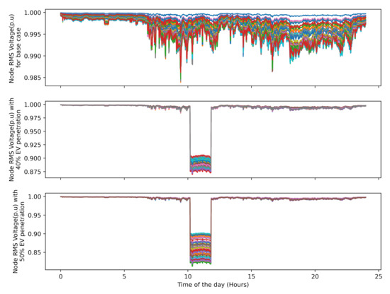 Comparison of RMS node voltages for different EV penetration scenarios. Each color corresponds to a node in the grid.