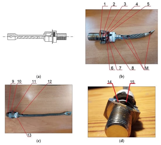 Diode D00-250-10 used in the works: (a) technical drawing, (b) view of the opened diode, (c) view of the closed diode, (d) view of the semiconductor junction, 1–16—surfaces observed, M—sample markers.