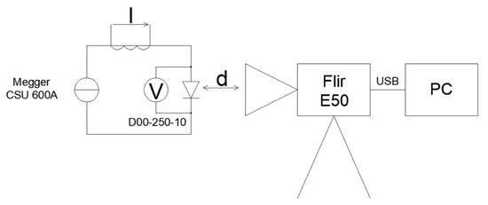 The observed diodes (closed and opened) were placed alternately in the system consisting of the CSU 600A power source (Megger, Dover, England) and the Flir E50 thermal imager (Flir, Wilsonville, OR, USA). The thermal imager was connected via USB interface to a laptop equipped with Flir Tools software. The schematic diagram of the measurement system is shown in Figure 2.