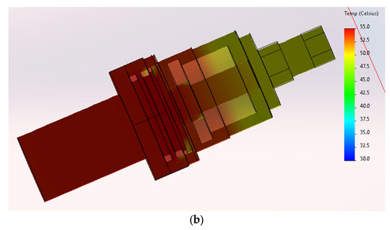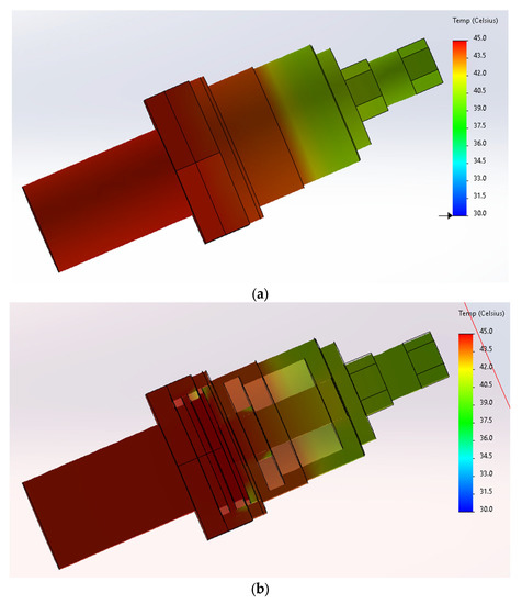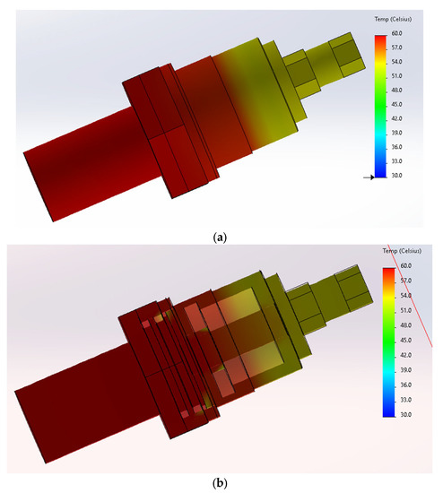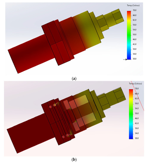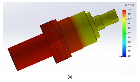 As a result of the simulations, temperature distributions were obtained, as shown in Figure 3, Figure 4, Figure 5 and Figure 6.