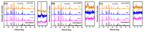Figure 1 shows the XRD patterns of the Al-LLZO, Al-LLZTO, and Al-LLZNO with different hours of air exposure. Figure 1a shows that Li2CO3 appeared on Al-LLZO surfaces, the intensity of which increased with an increase in time of air exposure, due to the gradually increasing amount of Li2CO3 [38]. On the contrary, XRD patterns of the Al-LLZTO and Al-LLZNO showed a negligible intensity of Li2CO3 even after 72 h exposure (Figure 1b,c). The XRD results indicate that Al-LLZO surfaces had a larger amount of Li2CO3 than Al-LLZTO and Al-LLZNO surfaces.