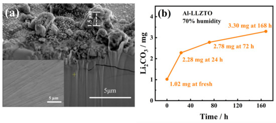 It is well known that the Li2CO3 formed on the garnet surface is generally not very thick, which leads to a weak peak intensity in XRD patterns. Due to the low thickness of surface Li2CO3 on the garnet matrix, the peak intensity of Li2CO3 is weak and unobvious to distinguish. The observable Li2CO3 peak for Al-LLZO implies that the Al-LLZO surfaces had a large amount of Li2CO3. No observable Li2CO3 peak for Al-LLZTO and Al-LLZNO does not indicated the absence of Li2CO3 on the surface. As revealed by focused ion beam scanning electron microscopy (FIB-SEM), shown in Figure 2a, the formed Li2CO3 is not continuous but island-like on the Al-LLZTO surface after 72 h of exposure, compared with the pristine SEM image of Al-LLZTO (inset of Figure 2a). The maximum island was approximately 1.5 μm in size. Furthermore, as can be seen in Figure 2b, titration gas chromatography (TGC) analysis indicated that the growth of Li2CO3 on the Al-LLZTO surface occurred in two stages. Within the initial 24 h, the growth was fast with a rate of 0.053 mg/h. Then, the growth slowed down with a saturation tendency, the rate of which was approximately 0.007 mg/h. Initially, the pristine surface of garnet was fully exposed to the air, leading to a rapid reaction with H2O/CO2 in the air. Li2CO3 was quickly generated during this initial process, as indicated in Figure 2b. Afterward, the surface sites of garnet were gradually covered by Li2CO3, leading to reduced contact area with air, thereby decreasing the generation rate of Li2CO3. Thus, a decreased slope of Li2CO3 amount vs. time was detected during the middle process. Finally, when the garnet surface was fully covered by Li2CO3, the growth of Li2CO3 reached a saturation state.