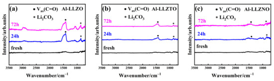Figure 4 shows the FTIR spectra of Al-LLZO, Al-LLZTO, and Al-LLZNO with different exposure time. The Vas (C=O) at 1438 and 863 cm−1 corresponds to the characteristic peaks of Li2CO3 [42,43,44]. The two peaks with large intensity for Al-LLZO confirmed the obvious Li2CO3 formation upon exposure to air for 24 h and 72 h. The peaks of Li2CO3 with weak intensity shown in Figure 4b,c indicate that Al-LLZTO and Al-LLZNO contained a smaller amount of Li2CO3 after exposure to air compared to Al-LLZO.