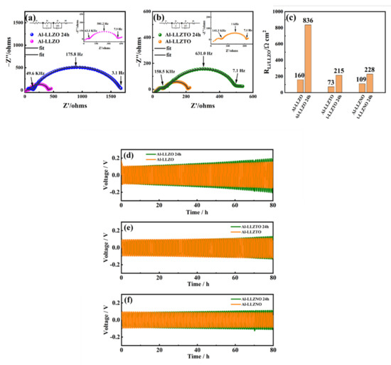 To investigate the effect of Li2CO3 on interfacial resistance, Li symmetric cells with 24 h air-exposed pellets were assembled. The electrochemical impedance spectra (EIS) of Li symmetric cells are plotted in Figure 5. As can be seen in Figure 5a,b, all the fitted EIS lines consisted of two half-circles in the measuring ranges. The high-frequency half-circle corresponds to the resistance of bulk impedance, while the medium-frequency half-circle corresponds to the interfacial resistance. Considering the charge transfer across two Li/LLZO interfaces in each symmetric cell, the interfacial resistance determined by the half-circle should be divided by 2 to obtain the value for each Li/LLZO interface. The fitted results of interfacial resistance are listed in Figure 5c. After air exposure for 24 h, the interfacial area resistance of Li/Al-LLZO greatly increased from 160 Ω·cm2 to 836 Ω·cm2, which was attributed to the blocking effect of Li2CO3 coverage [45]. For Al-LLZTO and Al-LLZNO, the interfacial area resistance also increased after 24 h of air exposure. The specific values for the three samples are given in Figure 5c. The interfacial resistance for Al-LLZO increased by a factor of approximately 5 after 24 h exposure, while that for Al-LLZTO and Al-LLZNO increased by a factor of 2–3. The galvanostatic cycles of Li symmetric cells for the three types of samples are shown in Figure 5d–f. It can be seen that Al-LLZO after 24 h exposure showed a larger potential increase during cycles than Al-LLZTO and Al-LLZNO. This is consistent with the above conclusions drawn from XRD, Raman, and FTIR analyses, i.e., the amount of formed Li2CO3 for Al-LLZO was larger than that for Al-LLZTO and Al-LLZNO.
