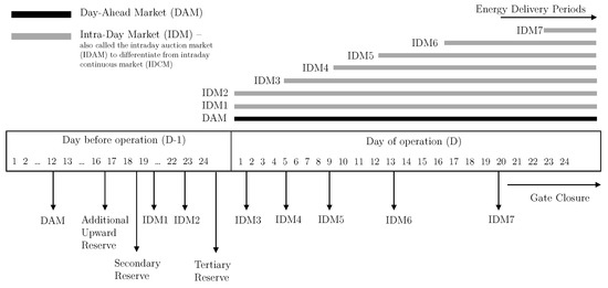 After DAM clearance, IDMs are instantiated to adjust DAM cleared bids and correct infeasible schedules. These modifications or corrections can be due to unplanned shutdown of dispatchable sources of generation, changes in ND-RES outputs, demand changes, etc. IDM sessions are especially useful for balancing renewable generation bid deficits or surplus by giving market participants with RESs an avenue to update their availability when their submitted DAM bids are different from near real-time realizations. There are seven IDM sessions; the first and second cover 24 h of the operation day while the remaining five sessions cover a receding subset of the 24 h [28]. There also exists a continuous intraday market that allows trading at European level for re-adjusting energy imbalances in between IDM auction sessions.