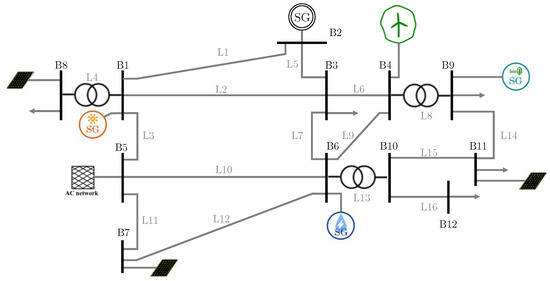 The VPP assets are dispersed across a 12-node network connected to the main grid through a PCC (bus 5) as shown in Figure 3. The capacities of D-RES, hydro (bus 6) is 111 MW. For ND-RESs, wind power plant (bus 4), solar PV (bus 8), and STU (bus 1) power block have rated capacities of 50 MW each. The thermal storage capacity associated with the STU is 1100 MWh. It is desired that, after an operation day, a predefined amount of such capacity is reserved for the first period of the next operation day such that it might be used to capture some benefits of early high prices before another charging period begins (see Equations (23) and (24)). Additionally, thermal storage can only be charged from the solar field and not from the main grid. The demands considered are industrial, airport, and residential loads (buses 3, 9, and 12) with minimum total consumption of 800, 580, and 600 MWh, respectively. Each demand has three profiles and the total consumption for each profile is the same.