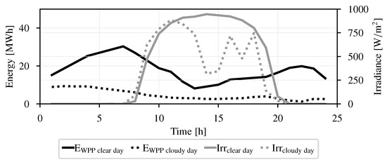 For each market window, uncertain generation profiles were generated by creating random profiles around the actual (measured) production of a selection of days, ensuring that such profiles are always within confidence bounds defined based on the standard deviation obtained from the whole historical series. Updated forecasts for late IDM windows have tighter confidence bounds than the DAM and early IDM ones, i.e., the random values that are generated are close to the actual production because uncertainty reduces as the delivery period is closer to the forecast time. Figure 4 shows estimated wind power output and irradiation levels in Southern Spain for a clear, sunny day in March 2014 and a day with cloud covers in March 2018.