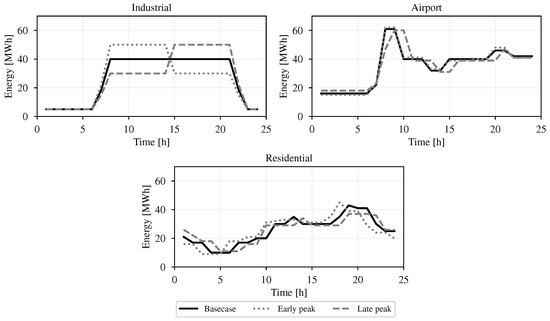 The low volume of energy traded in period 8–9 h coincides with very high demand and relatively low generation in the three cases. Moreover, in terms of benefits to the VPP, case (c) with three load profiles at zero cost has the highest profit because it leverages differences in the load shape and chooses the best profile to suit its objective. The residential late peak profile was selected in this instance while the early peak profiles were chosen both for the industrial and airport demand.