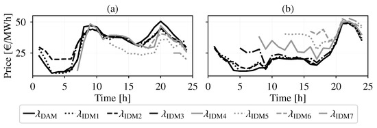 In Figure 6, representative prices for DAM and all IDM sessions for both clear and cloudy days are shown. The prices were obtained from [26] and analyzed to obtain representative prices for the conditions simulated. The later IDM prices (3–7) do not cover the entire operation horizon due to the range of their operation period as revealed in Figure 1.