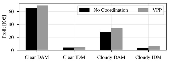A profit comparison between the days and the two strategies above is shown in Figure 7. For the clear day, there is a and increase in the profits during dam and IDM, respectively, when the VPP model is compared to the case without coordination; however, these profits are more significant during the cloudy day where the VPP outperforms the base-case with and during dam and IDM, respectively.