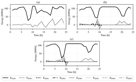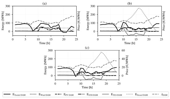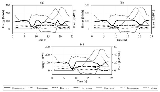 Figure 8 shows traded energy on a clear day during DAM and all IDM sessions and Figure 9 depicts the expected behavior of the different assets at DAM. The effect of coordination is evident from the smoothing of the traded power curve from period 10–16 h in VPP compared with the base-case. The differences arise largely due to proper synchronization of the STU with its storage and the biomass plant response to the market price.