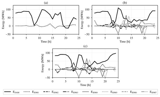 Traded power on a clear day at DAM and IDM in: (a) No Coordination; (b) VPP with default load profile; (c) VPP with three load profiles at zero cost.
