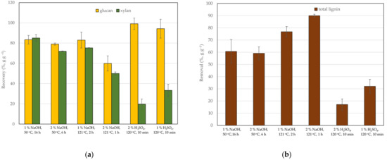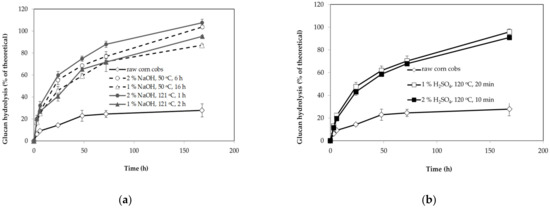 The efficiency of enzymatic hydrolysis of glucan from raw and pretreated corn cobs with sodium hydroxide: ((a) 1% NaOH, 50 °C, 16 h; 2% NaOH, 50 °C, 6 h; 1% NaOH, 121 °C, 2 h and 2% NaOH, 121 °C, 1 h) and sulfuric acid; ((b) 2% H2SO4, 120 °C, 10 min and 1% H2SO4, 120 °C, 20 min). Glucan hydrolysis efficiency was calculated based on the total conversion of glucan from pretreated corn cobs. The error bars present the standard deviation of values from two independent experiments.