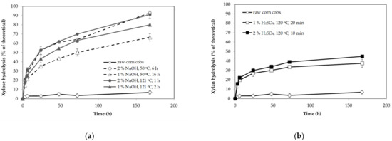 Efficiency of enzymatic hydrolysis of xylan from raw and pretreated corn cobs with sodium hydroxide: ((a) 1% NaOH, 50 °C, 16 h; 2% NaOH, 50 °C, 6 h; 1% NaOH, 121 °C, 2 h and 2% NaOH, 121 °C, 1 h) and sulfuric acid; ((b) 2% H2SO4, 120 °C, 10 min and 1% H2SO4, 120 °C, 20 min) condition. Xylan hydrolysis efficiency was calculated based on the total conversion of xylan from pretreated corn cobs. The error bars present the standard deviation of values from two independent experiments.