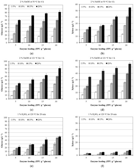 The effect of substrate loading (5%, 10%, 15% and 20%) and enzyme loadings (5, 10, 15 and 30 FPU g−1 glucan) were investigated by performing an enzymatic reaction with the commercial cellulase Cellic CTec2 for 72 h. Three pretreated biomasses were selected based on the total sugar yield (glucose + xylose) obtained by the digestibility test. Biomasses treated under the following conditions were chosen for further hydrolysis: 2% sodium hydroxide at 50 °C for 6 h, 2% sodium hydroxide at 121 °C for 1 h and 1% sulfuric acid at 120 °C for 20 min. The glucose and xylose concentrations were determined after 72 h and the efficiencies of glucan and xylan hydrolysis were also calculated (Supplementary Material). The monosaccharide levels of the three biomasses differed depending on the catalyst type and conditions applied in pretreatment. Obtained results were consistent with previous studies investigating acid and alkaline pretreatment of corn cobs [31,32,49]. As shown in Figure 4, the highest glucose and xylose concentrations were obtained by hydrolysis of lignocellulosic biomass pretreated with 2% alkali, suggesting that alkali-pretreated biomasses are in general more digestible than acid-pretreated biomass, regardless of pretreatment conditions. As expected, glucose and xylose levels consistently increased with substrate and enzyme loading for all three pretreated lignocellulosic biomasses. The increase in substrate and enzyme loading positively affected sugar concentration.