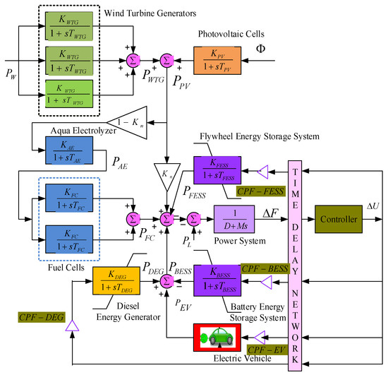 The proposed ESSA method is applied tried for frequency regulation of hybrid power system (HPS) as shown in Figure 2. It contains PV, WTG FC, DEG, AE, BESS, FESS, and electric vehicles, etc. [4,36,37,38,39]. The performance of HPS in the presence of wind and solar generation is extremely erratic and therefore the power balance is a complex task. Hence this problem can be resolved by appropriate management among stability and controllability. In this study, a partially decentralized controller is engaged, which makes it a modest control and requires less maintenance as well as dealing with fewer controllable parameters. Limiters are involved in each component to match fluctuations in the electromechanical features of the specific subsystem. In addition, time delays associated with input/output to the controller (10 ms) are considered. In Figure 2, the control participation factors (CPF) of controllable sources such as DEG, FESS, BESS, and EV are represented by corresponding CPFs.