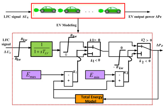 The figure presentation modeling of EV for frequency control is demonstrated in Figure 3 [40]. The LFC signal is supplied to the EV for discharging/charging. Parameters signify the battery capacity. The existing battery energy is signified by E that is kept inside the restrictions and presumed as 90% and 60%. and are found as , . The stored energy part in Figure 3 computes the remaining stored energy [40].