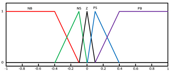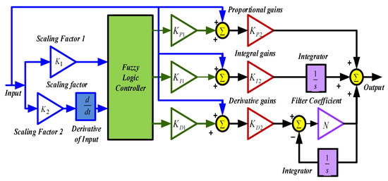 The fuzzy logic control (FLC) based PID controller can be designed by tuning scaling factors and PID parameters [41,42,43,44,45]. In the present work, a combined fuzzy PID (CFPID) is projected as revealed in Figure 4 [45]. To ensure that the controller is adaptive, the input signal is accepted by fuzzy and also straight to the PID as revealed in Figure 5. The membership functions are allocated linguistic PoBg (Positive Big), PoSm (Positive Small), Ze (Zero), NeSm (Negative Small), and NeBg (Negative Big) for inputs/output variables as shown in Table 5. A Mamdani fuzzy inference engine is used in the present study.