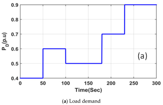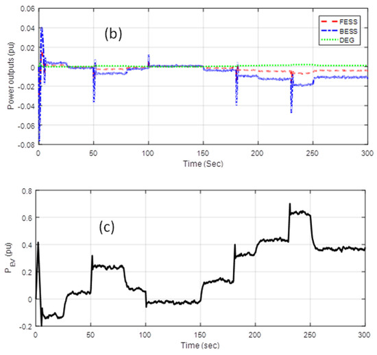 Here, solar and wind generation and load outlines as specified in Figure 8 are presumed. The dynamic response with ESSA-based PID, CFPID, and PD-CFPID is presented in Figure 9. It is clear from Figure 9a that the performance with PD-CFPID is slightly better than PID and CFPID. The power outputs with the proposed PD-CFPID controller are shown in Figure 9b,c. In the time range t = 50 to 100 s it can be seen from Figure 8a that PD is 0.6 pu. The PWTG is around 0.4 p.u., PPV is 0.2 pu which is clear from Figure 8b,c. Aqua electrolyzer takes 0.24 p.u. from the generation of renewable sources used by a fuel cell and the fuel cell gives a power that is equal to 0.0001 pu. DEG also becomes coupled to DPS at t = 50 s and supplies a power equal to 0.007 p.u. which is revealed in Figure 9b. The whole generation is obtained by totaling the power generation from the renewable sources less the aqua electrolyzer power, and by adding the power from DEG the fuel cell becomes 0.367 p.u. This is 0.23 p.u. less than PD so BESS, FESS, and electric vehicles (EV) deliver less power to meet PD. PFESS = 0.0075 p.u., PBESS = 0.0022 p.u., PPEV = 0.23 p.u. which are exhibited in Figure 9b,c. When the power is released by the storage devices and power discharged by Pev is added to the generated power, the supply power becomes 0.6 p.u., which is the same as PD. Hence, the power balance is maintained and the system is frequently stable.