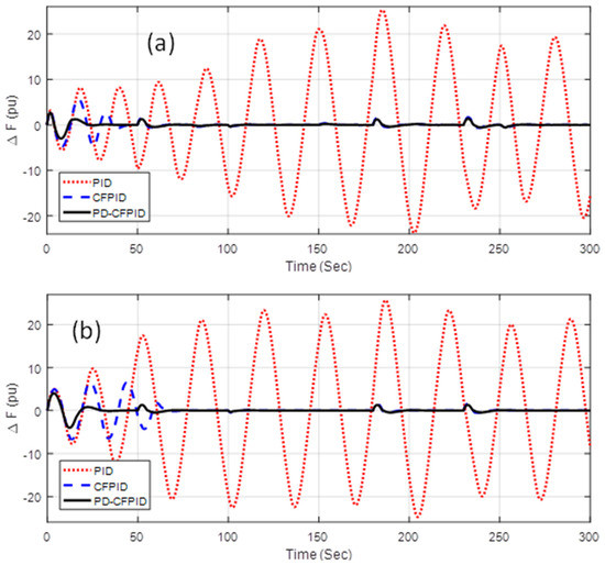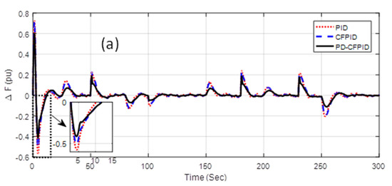 The responses for the above situations are presented in Figure 10a–e. It can be comprehended from Figure 10a that, for scenario A, when solar, wind powers, and load demand patterns are increased by 200%, the system is unstable with the PID. System stability is preserved with both CFPID and PD-CFPID. However, the response degrades with CFPID under scenario A whereas the response remains unaffected with the proposed PD-CFPID controller. For scenario B, when PWTG and PPV are unavailable but the PD is augmented by 200%, the system is unstable with PID. The response further degrades with the CFPID controller in scenario B compared to the same for scenario A. with the proposed PD-CFPID controller, the response remains more or less the same. For scenarios C, D, and E, the system is unstable with both PID and CFPID controllers as evident from Figure 10c–e. However, the system stability is retained with the suggested PD-CFPID controller and frequency deviations lie inside the acceptable boundary.