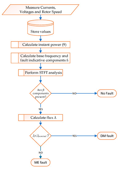 However, to ensure the proposed strategy performance, the estimated flux value is filtered using a moving average filter with exponential forgetting. In addition, the filter has a variable forgetting factor, starting from a maximum value which decreases over time with a predefined factor to a minimum. This way, the filter can be reset when required (e.g., in a detected steady-state condition). The flow chart of the proposed methodology for DM fault detection is illustrated in Figure 1.