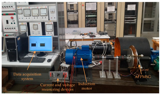 The AFPMSG is driven by a three-phase induction motor. Three current and three voltage hall-effect transducers were used to perform the stator voltages and currents measurement. Acquisition of the measurement values is performed using a LabView data acquisition card. The sampling frequency was set to 10 kHz. The measured data is collected in an ASCII file and the fault analysis is performed offline. To obtain the DM fault behavior without introducing eccentricity, one of the rotor magnets is removed and replaced by a part of equal weight.
