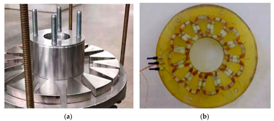 (a) One of the two rotors with 16 permanent magnets, (b) the resin-immersed coils of the stator [2].