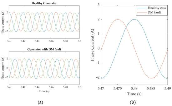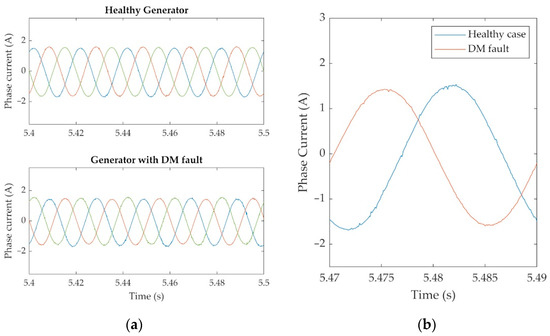 Experimental results: (a) three phase stator currents waveform for healthy generator and for DM fault, (b) focused stator currents waveform at healthy case (blue) and demagnetized case (red). (Generator operating under nominal voltage and frequency, with a load of 225 W.)