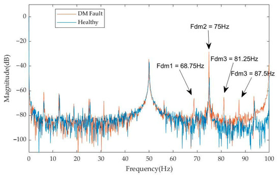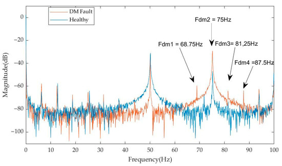 Power spectrum for DM fault (frequency changes from 25 Hz to 50 Hz—examined fault indicative frequencies are shown with the blue arrows).
