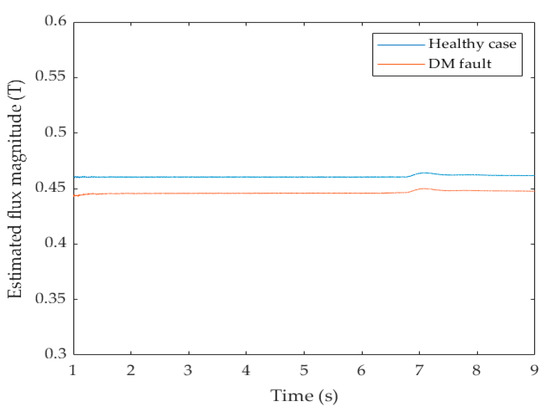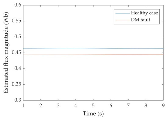 Experimental results: estimated flux magnitude for healthy generator and for DM fault (generator operating under nominal voltage and frequency, with a load of 225 W).