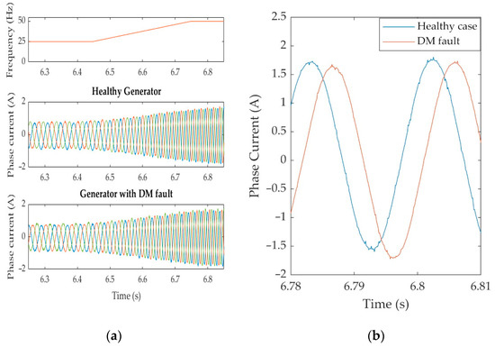 (a) Experimental results: stator currents for healthy generator and for DM fault (frequency changes from 25 Hz to 50 Hz); (b) focused results for stator currents at healthy case (blue) and demagnetized case (red).