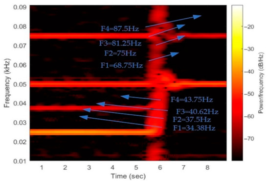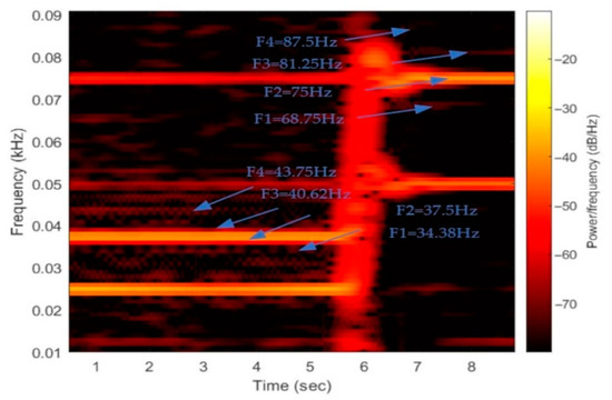 Finally, experimental tests have been performed to test the validity of the proposed fault-detection methodology during transient operation of the generator. These tests included operation of the machine considering variable load and rotating speed. Hereafter, characteristic results from a fast speed change of the generator, when the rotor speed doubles within a time interval of 0.4 s. As the FFT algorithm fails to perform due to the variable frequency, STFT analysis is used, as described. Results shown in Figure 11, Figure 12, Figure 13 and Figure 14 prove that the fault can also be reliably detected at variable speed, combining the information obtained by the STFT and the flux estimation. More specifically, in Figure 11 the currents of the healthy and demagnetized machine are presented for a speed change. In Figure 12 and Figure 13, the results of the STFT algorithm are presented for both the healthy machine and the demagnetized case, respectively. The instantaneous power frequency components (34.38 Hz, 37.5 Hz, 40.62 Hz, 43.75 Hz), produced for fs = 25 Hz and k = 11, 12, 13, 14, can be detected at a time interval of 0–6 s at Figure 13 (demagnetized case), while they are not shown at Figure 12 (healthy). Additionally, when electrical frequency becomes 50 Hz at the time interval of about 6–10 s, it can be noticed that frequency components shift to the new values corresponding to fs = 50 Hz (68.75 Hz, 75 Hz, 81.25 Hz, 87.5 Hz) at Figure 13, while these components do not show in Figure 12. It is worthy to refer that the frequency component of 75 Hz is present both in the healthy and demagnetized case for fs = 50 Hz and the frequency component of 37.5 Hz for fs = 25 Hz, but with a bigger amplitude in the demagnetized machine. The arrows depict the four frequency components for operation frequencies fs = 25 Hz, 50 Hz both at healthy and demagnetization condition. In Figure 14, the estimated flux amplitude is presented for speed change from 25 Hz to 50 Hz.