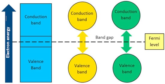 Based on the electrical conductivity, materials can be categorized into conductors, semiconductors, or insulators. Conductor materials have a high electrical conductivity in the range of 107 Ωm−1, whereas insulators have low conductivity in the order of 1010 Ωm−1. Semiconductors are located between the other two groups, having electrical conductivity in the range of 10−6 to 104 Ωm−1; this difference in conductivity originates from the energy bands. Electrons reside in specific bands, in which the lower energy valence band includes valence electrons, whereas the higher energy position is entitled the conduction band and is empty in the ground state. The energy variance between these two energy bands is known as the bandgap, and the bandgap energy (Eg) corresponds to its magnitude. It should be noted that the electrons located between conduction and valence band energy levels cannot exit, and conduction occurs due to the movement of free electrons in the conduction band above the Fermi level. In conductor materials, the Fermi level lies in the overlapping region of the conduction and valence bands, as shown in Figure 1 [34,35]. In contrast, insulators and semiconductors have a bandgap between the valence and the conduction bands in which the Fermi level lies. Electrons can be excited to the conduction band by absorbing higher energies than the bandgap. The bandgap of semiconductor materials is narrower than that of insulators. If an electron (e−) is promoted to the conduction band from the valence band, one hole (h+) is generated in the valence band. The interaction between these electrons and holes leads to conductivity in semiconductors [36].