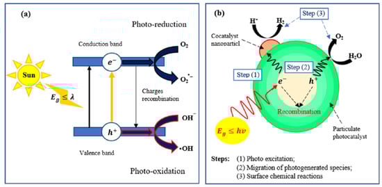 Semiconductor stimulation by photons with energies higher or equal to the semiconductor’s bandgap (Eg) leads to the promotion of an electron (e−) from the valence band (VB) to the conduction band (CB), generating a hole (h+). Both the excited state in the conduction band and holes in the valence band are thermodynamically and kinetically prone to recombine and spend the input energy through heat generation or light emission, as illustrated in Figure 2a [37]. By comparison, if electrons and holes migrate to the semiconductor’s surface without recombination, they can actively operate in electrochemical processes with species absorbed at the semiconductor surface. In this condition, photogenerated electrons act as reducing agents, and holes act as oxidizing agents. This redox capability of electron–hole pairs can be utilized in photocatalytic processes such as water/air remediation and hydrogen production.