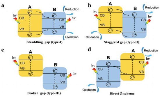 The electron–hole pairs’ migration under irradiation in various type of heterojunction photocatalysts: (a) type-I, (b) type-II, (c) type-III, and (d) direct Z-scheme, adapted from [40].