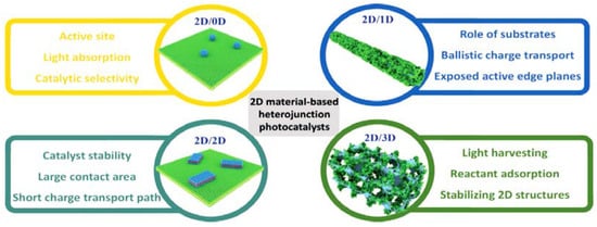 The morphology and structure of heterojunctions can substantially influence the activity of catalysts. In addition, the dimension and configuration can also affect the performance of heterojunction photocatalysts. It was shown that two-dimensional (2D) materials are among the proper candidates for photocatalysis applications because of their favorable structural and electronic properties, but they still need to be improved because of disadvantages such as electron–hole recombination and low redox ability. In this regard, wise and objective construction of 2D heterojunction photocatalysts with various arrangements and morphologies can improve the photocatalytic activity [41]; Figure 5 shows the design of proficient 2D heterojunction photocatalysts with differing configurations, applications, and properties, each of which has its advantages and disadvantages.