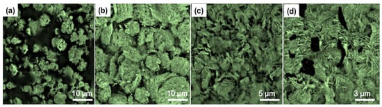 SEM micrographs showing (a) BWO−1, (b) BWO−2, (c) BWO−3, and (d) BWO−4.