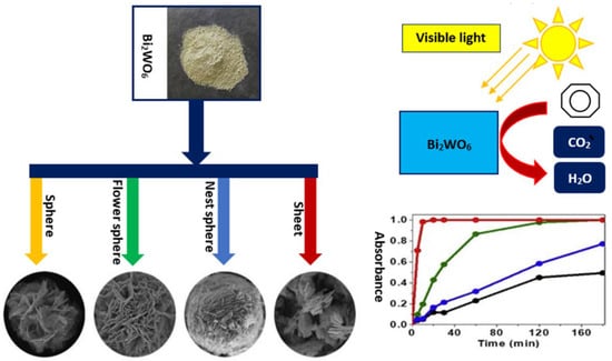 Zhu et al. [42] investigated the impact of Bi2WO6 morphology on photocatalytic degradation of volatile organic compounds under visible light. They fabricated four types of Bi2WO6 morphologies (nest-like or flower-like) through the facile hydrothermal method, including BWO−1, BWO−2, BWO−3, and BWO−4 with varying additives, synthesis temperature, time, and pH, as shown in Figure 6. It was shown that the nest-like Bi2WO6 structure manifested the most reaction active sites, leading to a 100% gaseous toluene degradation during only 20 min under visible-light irradiation. These abundant reaction active sites in the nest-like structure are due to their fine particle size, large photoresponse interval, narrow bandgap, improved electron–hole pair separation efficiency, and low electron–hole recombination rate, as shown in Figure 7 [42]. It was also shown that the double-shell Bi2O3/Bi2WO6 hollow microspheres demonstrated an improved photocatalytic activity because of the hollow presence in the structure and fabrication of the p−n junction between p-type Bi2O3 and n-type Bi2WO6 [43].