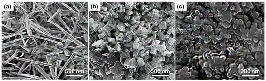 SEM micrographs showing the various morphologies of WO3 photocatalysts: (a) nanoplates, (b) nanorods, and (c) nanospheres.