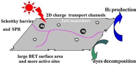 In a recent study, it was shown that the porous Ag/ZnO nanosheets with 3D self-assembled architecture act as a super photocatalyst for excellent organic pollutant degradation and hydrogen evolution [44,45,46], as schematically illustrated in Figure 9. These 3D porous structures are manufactured by a facile method following topological morphology evolution with low-temperature calcination. They showed highly photocatalytic activity with about complete degradation of 10 ppm 4-nitrophenol after just 25 min and a ~0.45 mmol g−1 h−1 hydrogen production rate [45]. The achieved excellent photocatalytic activity can be related to the morphological synergetic influence among 2D ZnO porous single-crystalline nanosheets and sliver species, and large surface area, improving separation and migration performance of charge carries and charge-collection efficiency [45]. In addition to morphology and structurally related factors, the defects can also influence the hydrogen production via heterojunction structures. Jing et al. [47] reported that the discrete defect energy-level introduction and reduction in the effective electrons’ mass can improve the separation and migration procedures of the photoinduced charge carriers in the ZnIn2S4 microflowers. This one-step hydrothermal strategy, via the introduction of S-defect-controlled ZnIn2S4 microflowers, can effectively regulate the lattice defects of 2D sulfide semiconductors in the high throughput photocatalytic solar-to-fuel conversion [47].