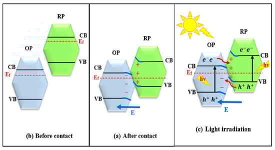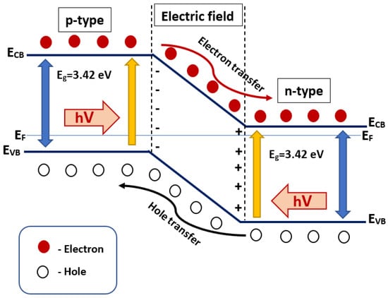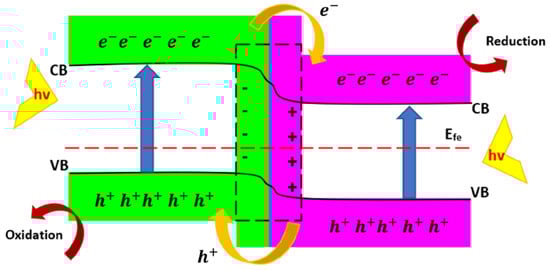 In this type of heterojunction, two contacting semiconductors generate a p-n junction with a unique charge zone, enabling it to transmit electrons and holes in the reversed direction, as illustrated in Figure 10. In this regard, holes are transmitted to the VB region of the p-type semiconductor, while electrons are transmitted to the CB region of the n-type semiconductor. The driving force for this electron–hole transfer is the electric field generated inside the space charge region (junction). During the exposure of p–n heterojunction to photons with equal or higher bandgap energies than those of the photocatalysts, the photogenerated electron–hole pairs can be separated instantly due to the formed electric field in the space charge region. In this condition, the holes are moved to the VB zone of the p-type and the electrons are transferred to the CB region of the n-type semiconductors. This type of p-n semiconductor has many advantages, including (i) very effective charge separation; (ii) accelerated charge transfer; (iii) increased charge carriers’ lifetime; and (iv) a regional separation of incompatible redox reactions in nano space [48].