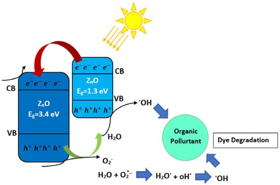 Photocatalytic decontamination is a promising procedure for environmental protection, with the ability to oxidize and mineralize numerous organic contaminants. Zinc oxide (ZnO), because of its favorable photoactivity, stability, availability, and nontoxic nature, is among the most interesting photocatalysts [48]. Unfortunately, ZnO suffers from a very poor response to visible light and unfavorable recombination of photogenerated species; thus, the constructing heterojunctions having the suitable band edges can substantially overcome the ZnO shortcomings and improve its photocatalytic performance. It was reported that ZnO-based binary and multiple heterojunction/nanocomposite photocatalysts, such as hydrothermally fabricated ZnO/CuO heterostructures, exhibit the best photocatalytic activity [49], as shown in Figure 11.