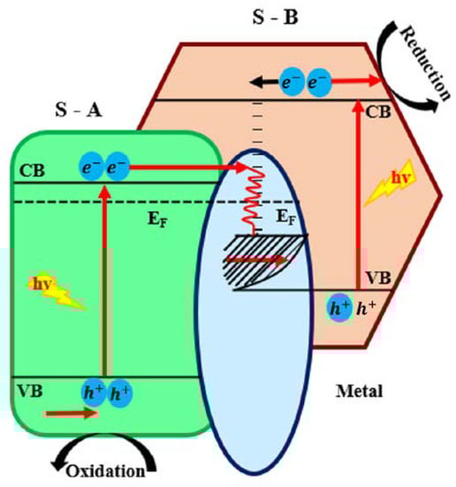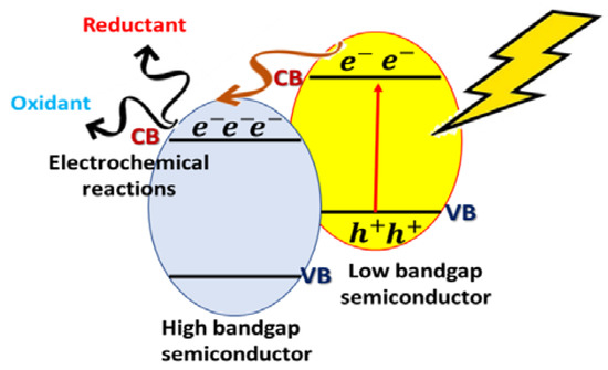 In this kind of heterojunction, just one of the components is active and able to fabricate electron–hole pairs under visible-light irradiation, whereas the second component cannot produce photogenerated carriers. In this condition, the CB electrons of one component with a low bandgap energy can be transferred to the CB of the other component with high bandgap energy, and leave the hole in the VB of the exciting component. Subsequently, electrons can interact in surface chemical reactions, as shown in Figure 13. It must be mentioned that the conduction band position of the low bandgap semiconductor must be above that of the high bandgap component. This kind of heterojunction is used to broaden the absorption range of UV light active semiconductors toward visible light.