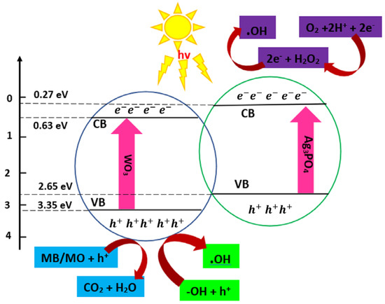 Until now, several heterojunctions from Type II have been introduced and investigated, such as a semiconductor containing graphitic carbon nitride (g-C3N4). Due to their small bandgap and layered structure, these semiconductors have promoted charge carrier portability and maximized charge carrier separation under visible light. Some of these graphitic carbon nitride semiconductors are graphene-g-C3N4, g-C3N4-BiOBr, g-C3N4-CdS, In2O3-g-C3N4, g-C3N4-Ag3PO4, g-C3N4-Bi2WO6, and g-C3N4-TaON. Some of the other members of this group are bismuth-based composite catalysts, such as BiOCl-Bi2O3, Bi2O3-WO3, WO3-Bi2WO6, and Bi2S3-Bi2WO6. It should be noted that tungsten oxide (WO3) is a proper semiconductor candidate due to its substantial visible-light absorption (≥480 nm), exceptional optical properties, and adjustable bandgap. In addition, WO3 is highly beneficial because of its nontoxic and safe nature, economic cost, and durability in acidic and oxidative circumstances. The organic dye degradation by the WO3/Ag3PO4 heterojunction semiconductor and the related mechanism is shown in Figure 14 [55].