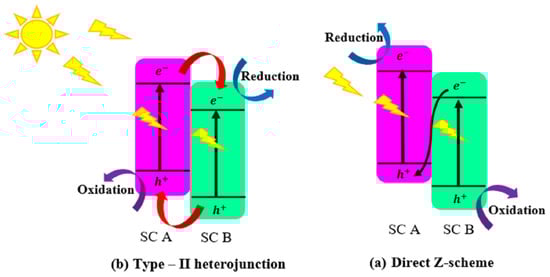 Type III heterojunctions, like those of Type II, have two visible-light-active components, based on what is mentioned as the Z-scheme type. The natural photosynthesis (NPS) procedure in green plants converts the H2O and CO2 into O2 and carbohydrates with the Z shape photosystem, as shown in Figure 15 [56]; this Z-scheme has a two-step photoexcitation process. In the same manner, the synthetic Z-scheme systems that try to mimic natural systems also consist of two connected semiconductor photocatalysts that can keep the electron–hole pairs with proper reduction/oxidation abilities on active regions [57]. In this type, the band positions located similarly to photogenerated holes in the VB of semiconductor A are neutralized by photogenerated electrons of the CB in semiconductor B. When electrons transfer from semiconductor A to semiconductor B, charge carrier separation occurs with a similar mechanism to that of Type II. Meanwhile, the third generation of Z-scheme photocatalysts was introduced as direct Z-scheme photocatalysts, which are mainly utilized in solar-energy conversion due to their excellent potential for spatial-photogenerated electron–hole pair separation and their optimized oxidation and reduction ability. In fact, a simple Z-scheme photocatalysis is very much like Type-II heterojunction photocatalysis, but it has a distinct charge-carrier migration mechanism [58], as presented in Figure 16.