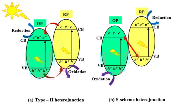 Despite the numerous advantages of traditional heterojunction systems and the Z-scheme group, they suffer from various shortcomings, which will be solved. Accordingly, a new group of heterojunction mechanisms was introduced for semiconductors, known as the S-scheme mechanism. The S-scheme heterojunction has both types of photocatalyst, oxidation photocatalysts (OP) and reduction photocatalysts (RP), with staggered band structures and similarities to the Type II heterojunction. However, the S-scheme mechanism has a very different charge-transfer condition; Figure 18 schematically shows the difference between Type II and S-scheme heterojunction. It should be noted that RPs have high CB and are commonly used in solar fuels. In RPs, electrons should be eliminated by sacrificial agents since they are more effective than photogenerated holes, although OPs are commonly used in environmental degradation, and in this case, holes are the main contributive factors and electrons are useless [71]. According to Figure 18, the typical Type II heterojunction has poor redox ability since electrons and holes are respectively piled up on the CB of OP and VB of RP. In contrast, in an S-scheme heterojunction, the energetic electrons and holes are respectively accumulated in the CB of RP and VB of OP, and the useless photogenerated charge carriers are recombined and lead to a powerful redox potential [72,73,74]. Hence, the S-scheme charge-transfer route follows the ‘‘step’’ shape at the macroscopic level (from low CB to high CB, Figure 18b), resembling the letter S, while microscopically resembling the letter N.