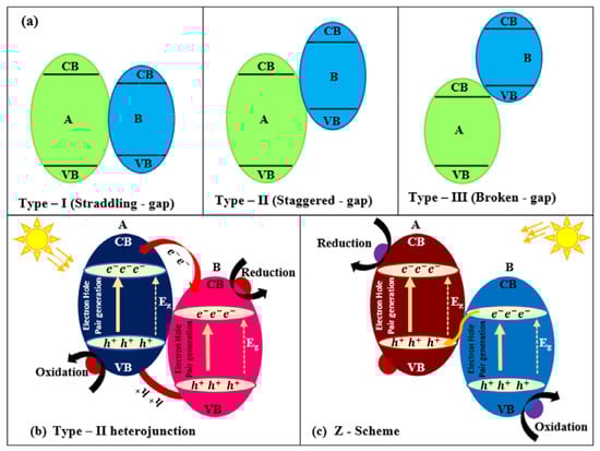 When the electron (the man in Figure 3a) jumps from the valence band (the ground in Figure 3a) into the conduction band (the sky in Figure 3a), it must immediately recombine with a hole (the ground in Figure 3a) because of Coulomb attraction between the electron and the hole (the gravity of the Earth). Thus, in order to separate the electron–hole pairs that are photogenerated (keeping the man off the ground), the employment of a semiconductor B is needed (Figure 3c,d) and the electron and hole pairs remain separated. The composite photocatalyst or heterojunction has been designed to solve the issues of maximum charge carrier recombination along with the minimum visible-light activity. Heterojunctions with proper design can considerably improve the separation of photogenerated electron–hole pairs; hence, they can readily move to the surface to become involved in subsequent electrochemical reactions [40], as illustrated in Figure 4.