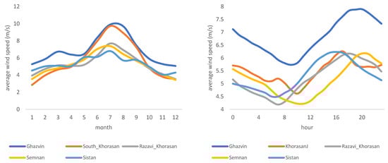 Diurnal and seasonal wind speed variation for Iranian provinces with average annual wind speed larger than 5 m/s.