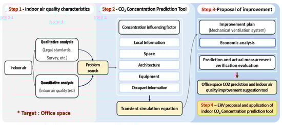 This research method was applied in four major steps, as follows: Step 1: Analysis of indoor air quality characteristics in office spaces; Step 2: CO2 concentration prediction tool for office spaces; Step 3: Development and verification of prediction tool considering economic feasibility; and Step 4: Proposal of ERV and prediction of indoor CO2.